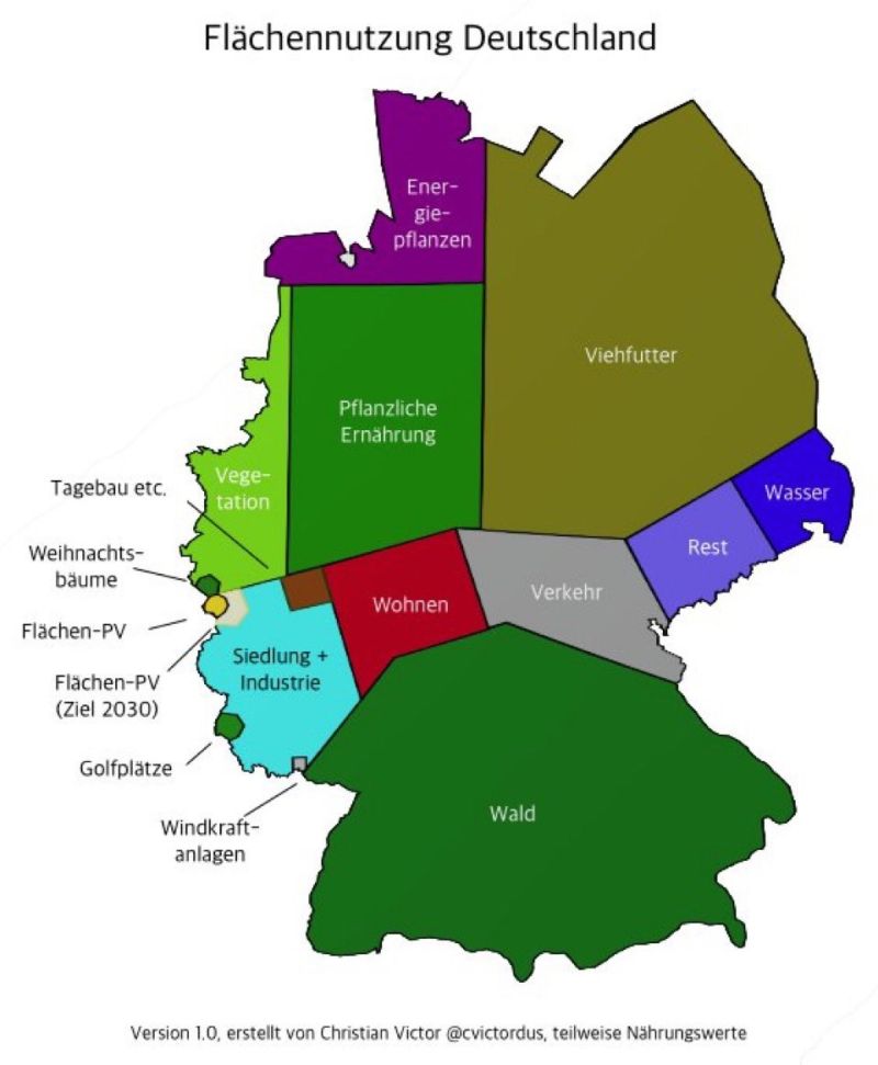 Um diese Diskussion zu versachlichen, kann es sinnvoll sein, sich zunächst zu verdeutlichen, wofür in in welchem Maße in Deutschland Fläche für die jeweiligen Zwecke belegt werden. Eine solche Aufstellung hat unlängst der Geograph Christian Victor erstellt. (siehe Karte oben).